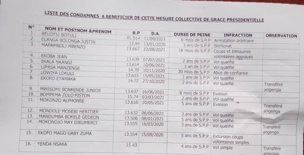 Après l’analyse d’un document authentique donné par le parquet de Mbandaka, 16 personnes sont bénéficiaires de cette grâce mais leur libération tarde toujours à intervenir.